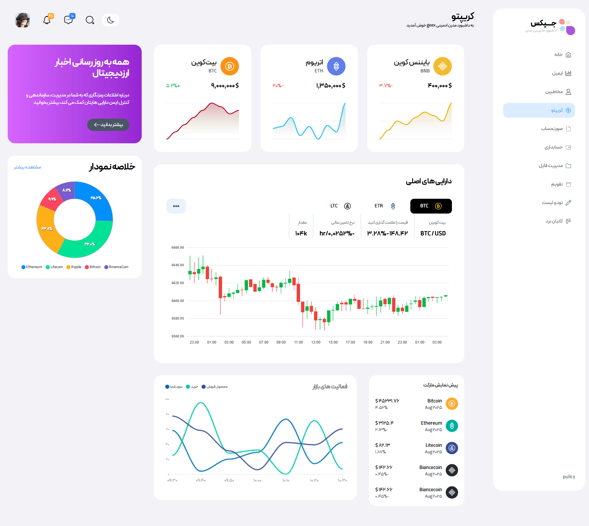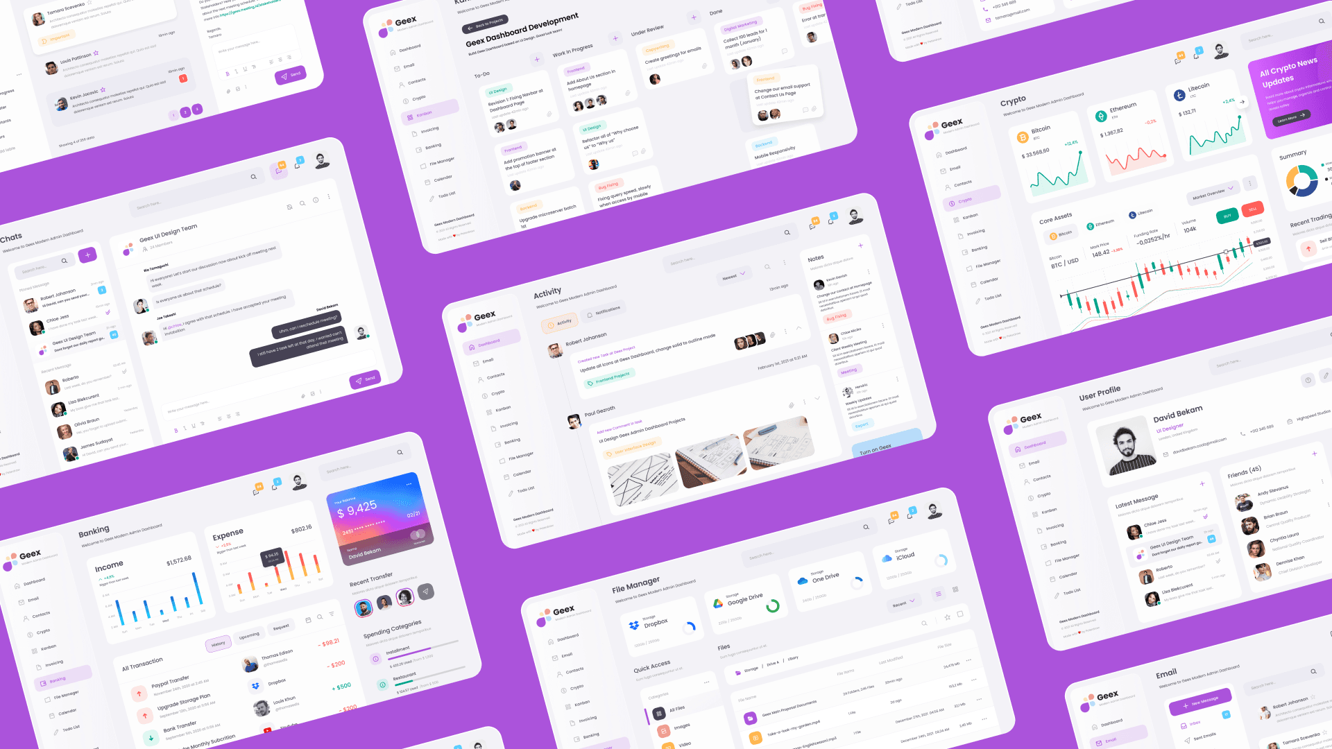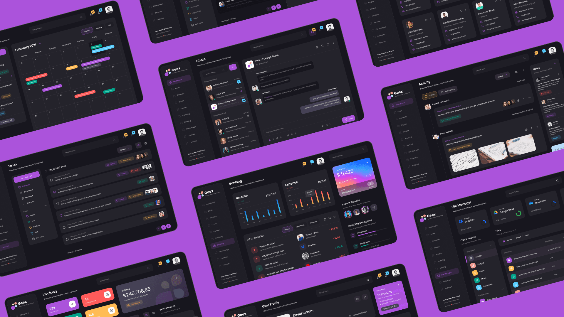 هدف از طراحی این داشبورد، ایجاد یک پنل مدیریتی مدرن و جامع برای کاربران است که بتوانند با یک نگاه کلی به وضعیت فعلی سیستم، تعاملات و محتواهای مهم، نظارت کامل داشته باشند. نمایی شامل پیامها، آمار رفتار کاربران، نسخههای فعالیت و بخشهای مرتبط با سرور و مشکلات، در این داشبورد طراحی شده تا تجربهای هدفمند و کاربردی برای مدیران فراهم شود. داشبورد GEEX با طراحی واکنشگرا و مدرن، تمرکزش بر UX مناسب برای تعامل سریع و اطلاعرسانی لحظهای است. کاربران میتوانند با استفاده از بخشهایی مثل «آخرین فعالیتها»، «نظرات کاربران» و «آمار بازدید»، بهراحتی روندها و تغییرات را پیگیری کنند. اضافه بر این، امکاناتی مانند مدیریت فایل، تقویم و لیست انجام امور، مجموعهای یکپارچه و قابل اعتماد برای مدیریت روزمره فراهم میسازد.